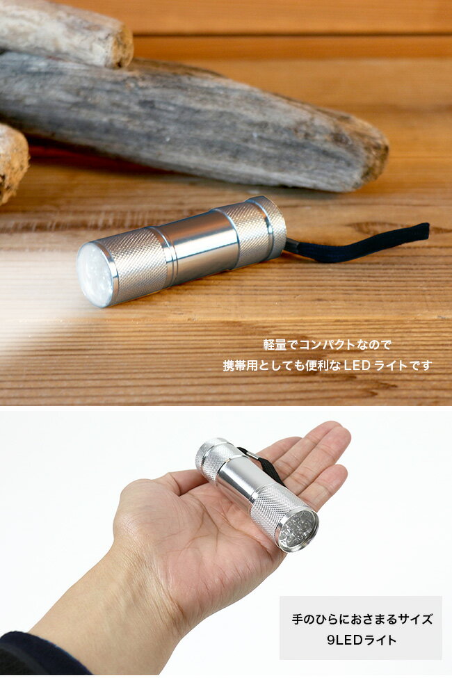 (※別売) 【 SPEC/製品仕様 】 ■商品名:9LED ライト ■カラー:シルバー ■サイズ:長さ95mm×直径25mm ■材質:アルミニウム・ラバー ■重量:約44g(電池含まず) ■電池:単4乾電池3本使用(別売) ■スイッチ:プッシュ式 ■備考:ストラップ付き ■原産国:中国 広告文責:株式会社カンパネラ ※PCモニター環境により、画像の色合いが若干異なる場合がございます、ご了承ください。